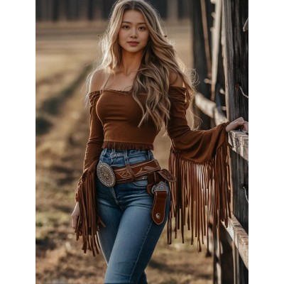 Women's Retro Western-Style Off-Shoulder T-Shirt with Fringe