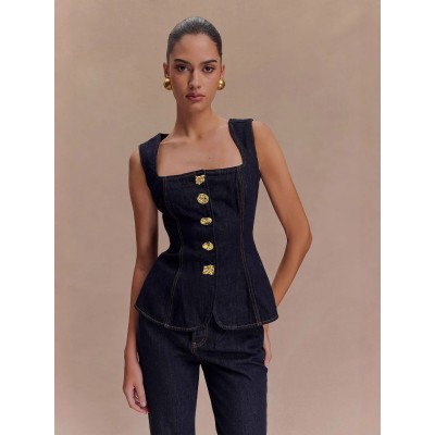 Modern-Style High-Waisted Denim Top and Pants Set with Button Details